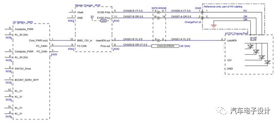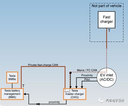 復用其功率引腳和控制系統,其中交流控制器系統是通過動力總成CAN(500kb)的連接進入的,而在直流充電時,采用一個快速充電CAN(125kb)的私有網絡,主要包含以下控制器,電池管理系統(BMS)和主充電器(主要負責對接外面的接口并把CAN的連接器建立起來)。如下圖所示: