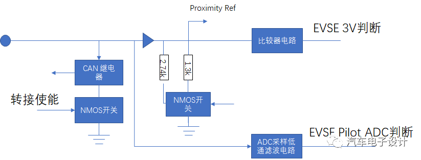 這里的電路結構是通過車載充電機的接口判斷電路進行的,接口輸入對Pilot進行判斷,然后在里面分成Pilot的ADC和數據判斷兩根,以電壓的值和ADC輸入兩個信號連接到車載充電機里面。如果采用交流,就用這套PWM的這套機制來弄,如果切換到直流,就使用繼電器接通CAN的繼電器來處理。