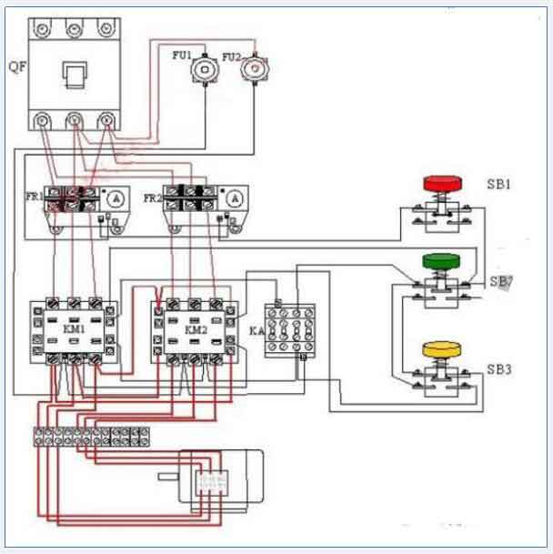 5、此控制回路中SB2的常開觸點與KM1線圈串聯(lián),SB2的常閉觸點與KM2線圈串聯(lián),同樣SB3按鈕的常閉觸點與KM1線圈串聯(lián),SB3的常開于KM2線圈串聯(lián),這種控制就是按鈕的互鎖控制,保證△與YY兩種接法不可能同時出現(xiàn),同時KM2輔助常閉觸點接入KM1線圈回路,KM1輔助常閉觸點接入KM2線圈回路,也形成互鎖控制。雙速電機控制電路接線圖.