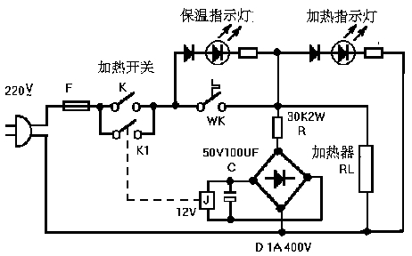 電源接通后,按下加熱開關K,電路接通,開始加熱。