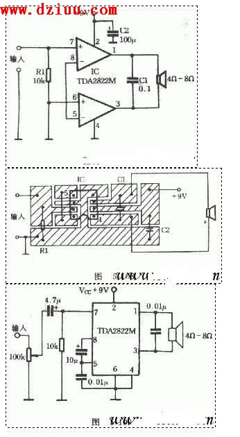 。用一塊TDA2822M功放集成電路接成BTL方式,外圍元件只有一只電阻和兩只電容,不用裝散熱器,放音效果也令人滿意的。 本文由m.zskn.com.cn整理提供,部分內容來源于網絡,如有侵犯到你的權利請與我們聯系更正。