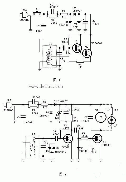 發射部分(見下圖1):發射部分由Q1、Q2接成復合管的形式組成頻率為135KHz的哈特利震蕩器。由C2、D1、D2、D3、C5等構成電壓為30伏的電源部分。當按下發射按扭P1時,在L1的副變感應出的135KHz的振蕩信號通過C1注入電力線路網絡。