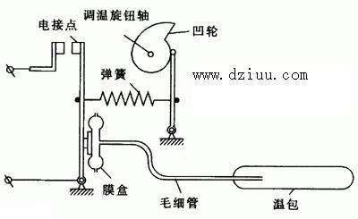 膜盒是用特殊材料做成的,極具彈性。開始杠桿一端的電觸點沒有閉合,當溫度升高時,溫包內的飽和蒸汽,受熱膨脹,壓力增大,通過毛細管的傳壓,使得膜盒也脹大起來。從而推動杠桿克服彈簧的拉力產生的力矩逆時針轉動,當溫度達到