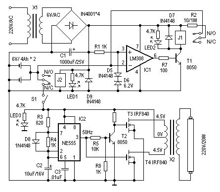 停電了,就會自動將蓄電池的電供給應急燈。下面提供應急燈的電路圖。