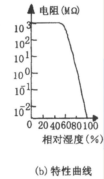 為室內濕度控制電路。該控制器由降壓整流電路、濕度傳感器、單穩定時電路,可控硅控制電路等組成。其中降壓整流電路為整個控制器提供VDD=+10V直流電壓。濕度傳感器采用型號為HOS201的濕敏電阻。其特性如圖(b)