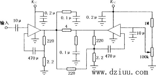 該電路圍繞2個芯片設置,一個是MC1458雙運放構成前置放大器,另一個為LM378雙4-watt放大器。前置放大器的增益由R3/R1獲得用于一側,另一側為R4/R2,大約為100。通過比率增加,增益隨之變化。 :