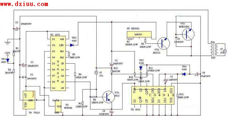 輸入電源電壓正常時,Y1A輸出高電平,Y1B輸出低電平,發(fā)光二極管LED及振蕩發(fā)聲電路Y1C、Y1D和喇叭不工作,控制部件J1也不工作。當(dāng)電壓高于250V或低于180V時,Y1B輸出高電平,發(fā)光二極管亮,振蕩發(fā)聲電路工作,發(fā)出鳴叫聲,控制寄電器J1閉合,當(dāng)J1的常開觸點外接交流接觸器時,就可控制主電路斷開電源。