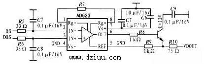 補償輸出分別送至AD623的反相和同相輸入端.在AD623的輸出端接一級射極跟隨器以增強信號的驅動能力。選用該器件可消除采用普通運放和外圍電阻所引起的輸出信號的溫度漂移。