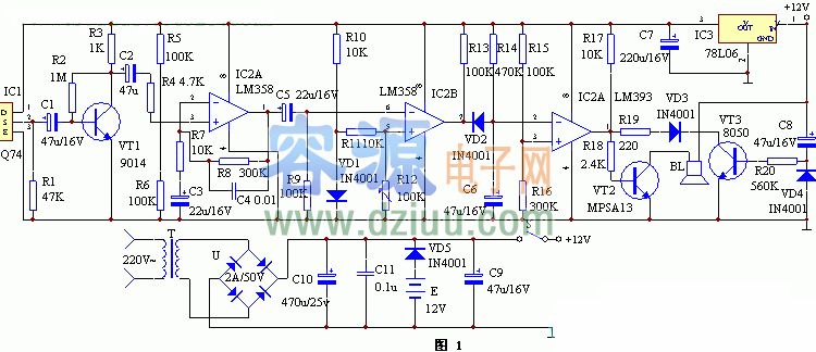 IC4的②腳變為低電平,它與IC4的③腳基準電壓進行比較,當它低于其基準電壓時,IC4的①腳變為高電平,VT2導通,訊響器BL通電發出報警聲。 <<版權聲明:本文由容源電子網(www_dziuu_com)整理提供,部分內容來源于網絡,如有侵犯到你的權利請與我們聯系更正!