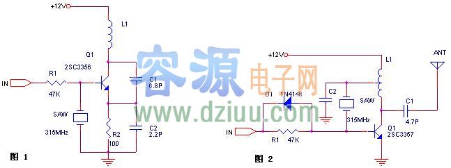 使用了聲表器件,電路工作非常穩(wěn)定,即使手抓天線、聲表或電路其他部位,發(fā)射頻率均不會漂移。和圖一相比,圖二的發(fā)射功率更大