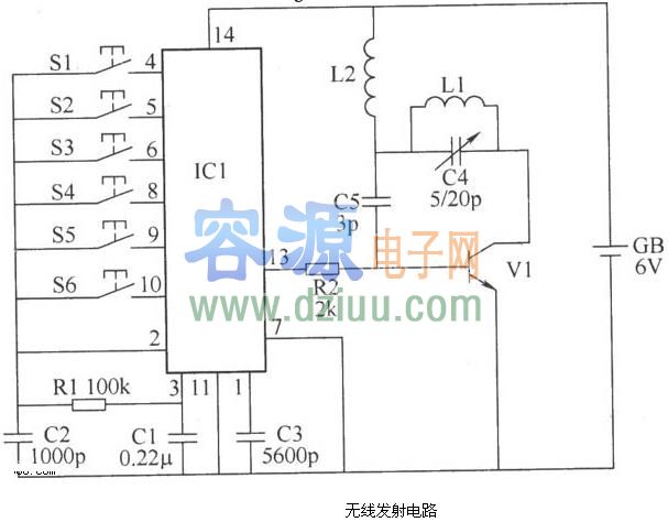 無線發(fā)射電路由編碼集成電路IC1、控制按鈕S1~S6、晶體管V1、電阻器R1、R2、電感器L1、L2、電容器C1~C5和電池GB組成,如圖