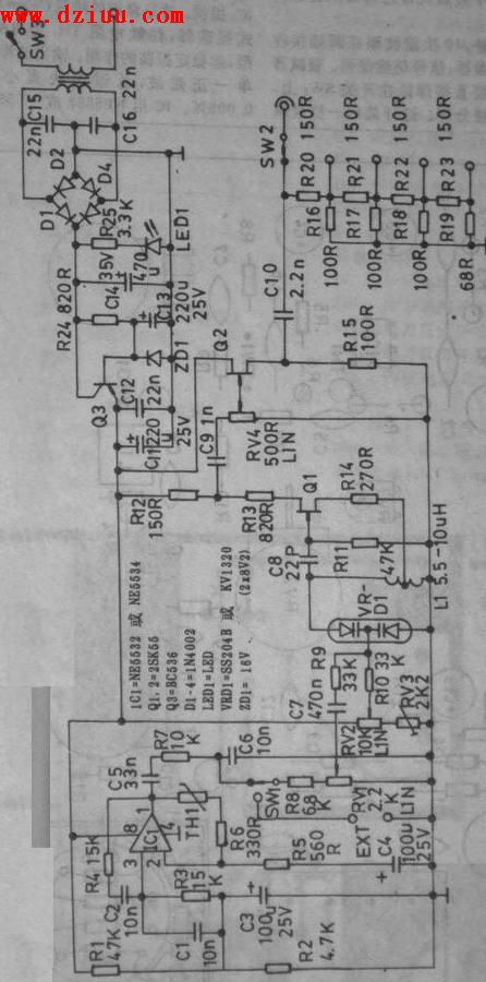 場效應管Q1為高頻振蕩器,性能穩定,振幅在整個頻度范圍內幾乎不變。Q1的漏極輸出約2V。R12和R13組成分壓器,以減小輸出強度。Q2與源極跟隨器
