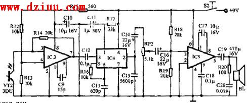 如圖為接收機原理圖。光電三極管VT2接收到對方發射來的光信號后,由集電極產生相應的信號電壓,此信號電壓經運算放大器IC3放大,