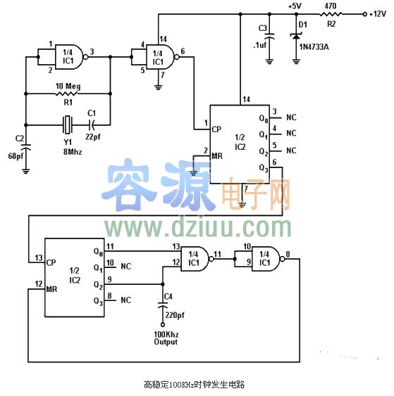 高穩(wěn)定100KHz時鐘發(fā)生電路 <<版權(quán)聲明:本文由容源電子網(wǎng)(www_dziuu_com)整理提供,部分內(nèi)容來源于網(wǎng)絡(luò),如有侵犯到你的權(quán)利請與我們聯(lián)系更正。》