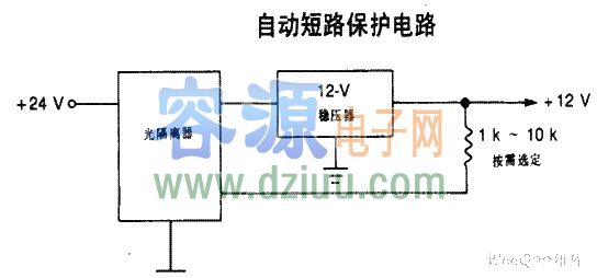 如圖為自動短路保護電路電路圖。 <<版權聲明:本文由容源電子網(wǎng)(www_dziuu_com)整理提供,部分內容來源于網(wǎng)絡,如有侵犯到你的權利請與我們聯(lián)系更正。》