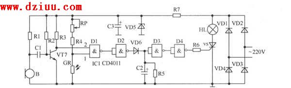 CD4011構(gòu)成延遲節(jié)能燈電路   <<版權(quán)聲明:本文由容源電子網(wǎng)(www_dziuu_com)整理提供,部分內(nèi)容來源于網(wǎng)絡(luò),如有侵犯到你的權(quán)利請與我們聯(lián)系更正。》