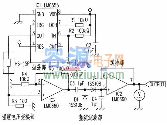 下圖是濕度表的電路,由五個部分組成。濕度,電壓變換部為HP-15傳感器:振蕩部由時基電路為傳感器提供600Hz矩形波:放大部由運放構(gòu)成11倍放大器:放大器的輸出被倍壓整流;最后由運放接成跟隨器作驅(qū)動輸出。 <<版權(quán)聲明:本文由容源電子網(wǎng)(www_dziuu_com)整理提供,部分內(nèi)容來源于網(wǎng)絡(luò),如有侵犯到你的權(quán)利請與我們聯(lián)系更正!