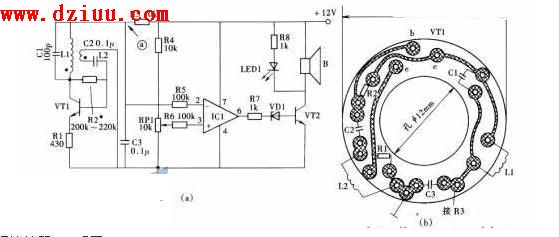 的環(huán)形印制板上。線圈L1用如。1mm漆包線在內徑為10mm的圓柱形變壓器骨架上密繞30匝,其外用同樣漆包線繞1匝