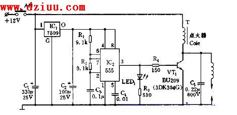 是由555定時電路、穩壓器、電阻、電容等組成的汽車電子點火器電路。本電路主要是