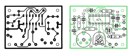 檢測器的PCB如下圖所示。除了L2之外,電路中沒有其他關(guān)鍵組件,因此構(gòu)造不應(yīng)出現(xiàn)特別的困難。只需將每個組件連接到零件視圖指示的位置即可。將光標(biāo)P1向左轉(zhuǎn)到最低靈敏度位置。檢測線圈的芯線為空氣,直徑約為7.5厘米,帶有40匝漆包銅線或20厘米直徑和25匝漆包銅線。線圈纏繞在一塊圓木或塑料排水管或排水溝的周圍。靈敏度范圍通過增加線圈直徑來增加。L1已購買,如果具有帶螺紋的鐵氧體磁芯,則可以省略C8。如果實際上電路不是很靈敏,則可以稍微提高R2值。