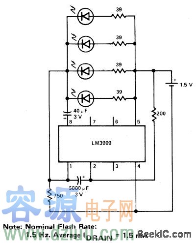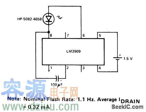 LM3909是一款單片振蕩器,專用于驅動發光二極管LED。當工作在1.5V或更低電壓時,可利用電容進行自舉電壓的提升,把2V以上的脈沖信號送至發光管。因此,巧用這款振蕩器可設計多種實用電路或玩具。