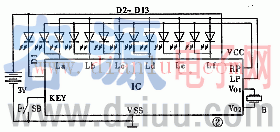 如圖是聲光電子轉盤電路原理圖。IC是用于抽獎品等電子游戲玩具或裝置中的專用集成電路,它可驅動13只發光二極管和一只蜂鳴器同時工作。 其具體工作原理是:當按下SB鍵后,會有嗒嗒的聲音,此時D1~D13依次點