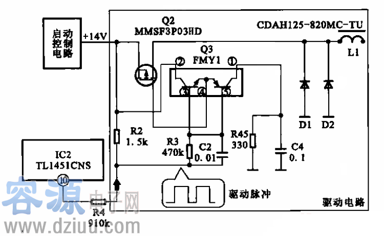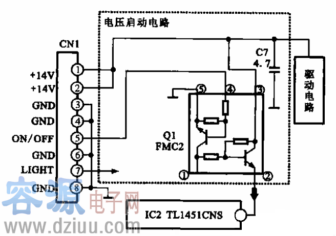 上圖所示為逆變器的電壓啟動電路,它主要元器件為Ql,主要作用是為PWM控制芯片(TL1451CNS)提供啟動信號。  在接通電源啟動顯示器時,插件CNI的⑤腳接收到控制電路傳來的高電平開啟指