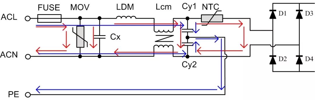 對ACL與ACN之間施加的浪涌電壓稱為差模浪涌電壓,差模路徑如圖中紅線所示;對ACL(或ACN)與PE之間施加的電壓稱為共模浪涌電壓,共模路徑如圖中藍線所示。