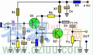 如圖所示為便攜式麥克風前置放大電路電路圖,該電路是一個低噪音的基礎上,高增益兩個階段PNP和NPN晶體管放大器,利用通過R6的直流負反饋穩定的工作條件比較準確。 :