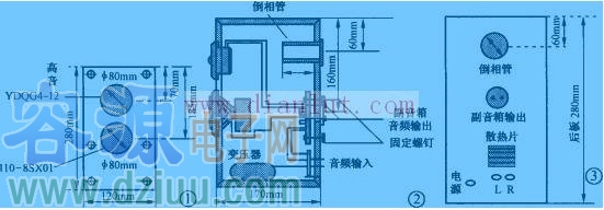 本音箱的高、寬、深分別為280mm×120mm×170mm(內部有效容積約3.4L)。板材為厚15mm的中密度板。左右聲道音箱前面板尺寸如圖所示。倒相孔設在箱體背面上方,長度為68mm,由于倒相管在音箱背面,所以擺放時音箱后