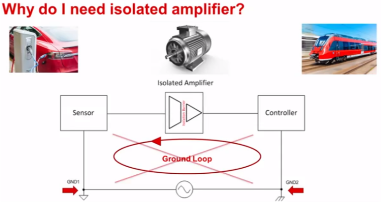 使用隔離放大器的一個(gè)常見原因是,為了斷開接地環(huán)路。電氣裝置可以在兩個(gè)遠(yuǎn)程節(jié)點(diǎn),接地1和接地2之間產(chǎn)生較大的接地電位差。這兩個(gè)接地之間的直接連接會(huì)最終形成一個(gè)接地環(huán)路。電機(jī)一類的設(shè)備可以向地面注入較大的噪聲電流,從而產(chǎn)生在信號(hào)路徑中出現(xiàn)的接地環(huán)路電流。隔離放大器可消除來自接地環(huán)路的信號(hào)路徑噪聲,保護(hù)系統(tǒng)免受接地環(huán)路電位差的影響。