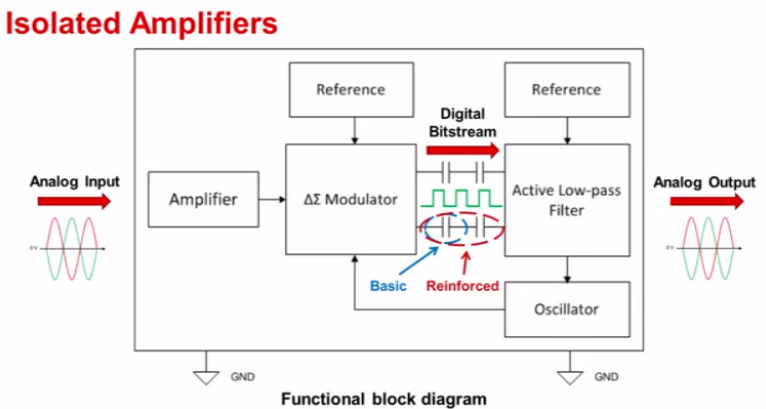 與傳統(tǒng)的非隔離式放大器類似,隔離放大器在輸入上有一個(gè)模擬信號(hào),且在輸出上有一個(gè)模擬信號(hào)。隔離放大器的輸入級(jí)由驅(qū)動(dòng)Δ-Σ調(diào)制器的全差動(dòng)或單端輸入組成。放大器的增益是固定的且通過內(nèi)部精密電阻器設(shè)定。Δ-Σ調(diào)制器在時(shí)鐘生成器中使用內(nèi)部基準(zhǔn)電壓將模擬輸入信號(hào)轉(zhuǎn)換為數(shù)字比特流,然后使其傳輸穿過隔離層。比特流在隔離層的低側(cè)經(jīng)模擬濾波器處理后,會(huì)在輸出端呈現(xiàn)為差動(dòng)模擬電壓。