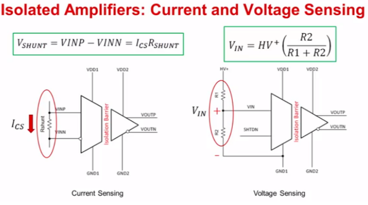 這是隔離放大器的一些常見應(yīng)用示例,電流傳感和電壓傳感。TI提供了各種可實(shí)現(xiàn)分流式電流傳感的隔離放大器,其輸入范圍為正負(fù)50毫伏或正負(fù)250毫伏。隔離放大器的輸入電壓范圍根據(jù)所要測(cè)量的電流來確定分流電阻器的值。對(duì)于使用分壓的電壓傳感應(yīng)用,TI可提供輸入范圍高達(dá)正負(fù)12伏的隔離放大器。
