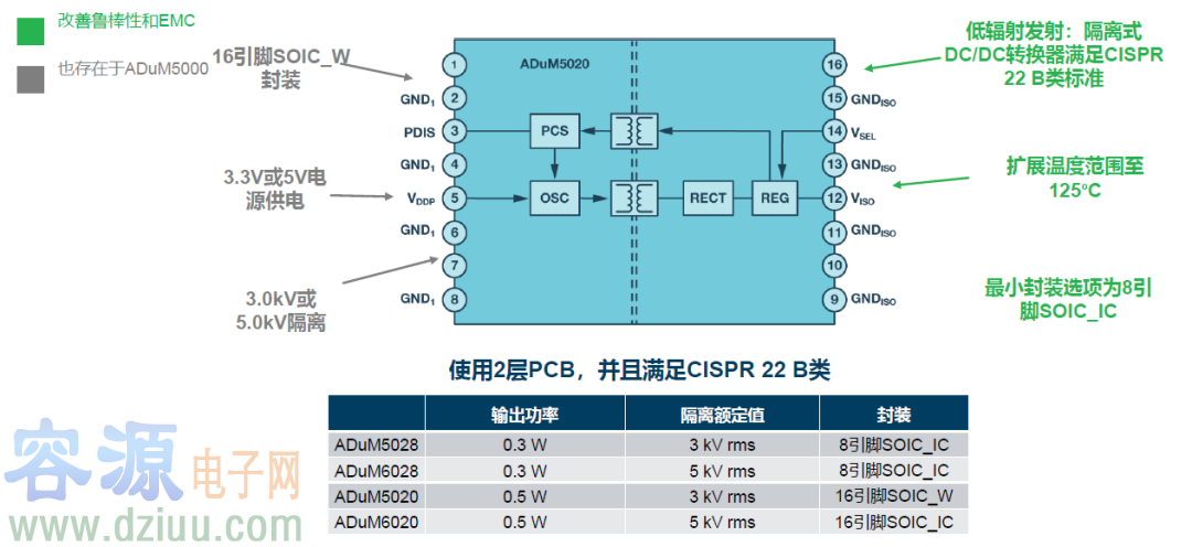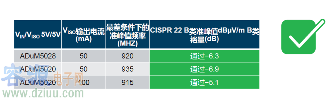 ADuM5020采用16引腳寬體SOIC封裝,而對于ADuM5028,可以選擇的最小封裝是8引腳SOIC。ADuM5020/ADuM5028提供3V和5V兩種電源選項,以及3kV rms額定隔離。 為了減少輻射發射,ADuM5020/ADuM5028具有出色的線圈對稱性和線圈驅動電路,有助于將通過隔離柵的CM電流傳輸最小化。擴頻技術也被用來降低某一特定頻率的噪聲濃度,并將輻射發射能量擴散到更廣泛的頻段。在次級端使用低價鐵氧體磁珠會進一步減少輻射發射。在RE合規測試期間,這些技術可以改善峰值和準峰值測量水平。