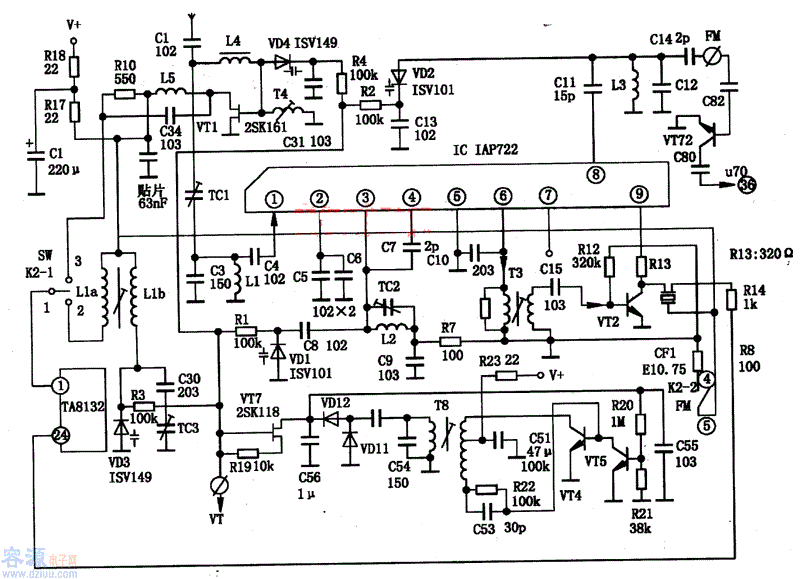 lAP722的⑨腳為電壓控制端,受波段開關控制。當波段開關打在FM位置時,K2-2與④、⑤腳接通,lAP722得電工作。