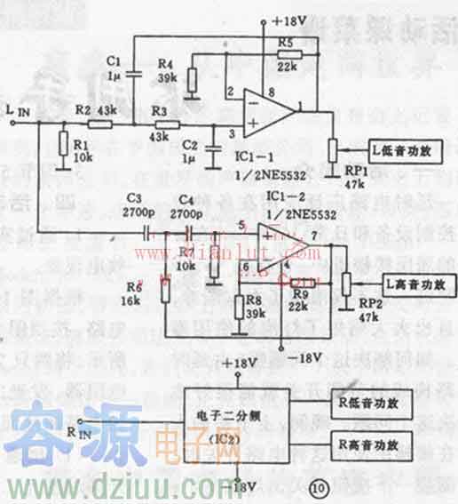 上圖所示為電子二分頻功率放大器的圖解。與傳統分頻方法相比,在功效前采用電子分頻器,則完全避免了功放后LC分頻器的大電流信號、體積大、制作成本高、制作和調試困難、插入損耗和功效的阻尼特性變差的缺點,并