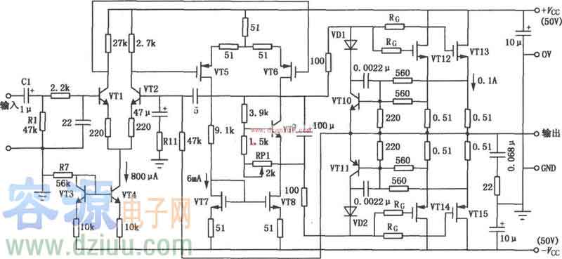 此電路圖是用功率MOSFET管構成的功率放大器電路。電路中差動第二級采用型號為2SJ77的MOSFET,電流鏡像電路采用2SK214。其工作電流為6mA,但電源電壓較高(±50V),晶體管會發熱,因此要接入小型散熱器。 :
