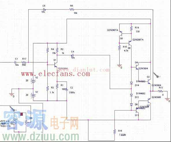功率放大器電路是使用雙20V電壓電源,提供15W的不失真功率在8歐姆負載的時候。Q1 經營在共同的放射器, 輸入信號通過對偏壓管子包括Q8, Q9 、D6 、D13 和D14 。Q8 和Q9 提供恒流偏壓, 產品階段減到最小由分離darl