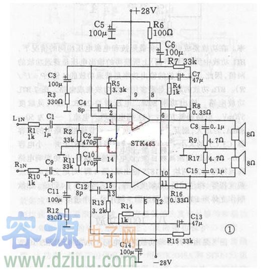圖是2×30W雙聲道音頻功率放大器,其核心器件ICl采用高保真音響功放集成電路STK465,該電路內包含兩個性能指標完全相同的功率