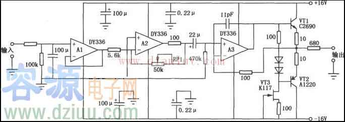 如圖所示電路是功放前級的其中一路放大電路。電路采用3只DY336低噪聲、高品質運放。其中A1用作輸入信號的緩沖跟隨器,以減輕信號源的負擔。A2和RPl組成負反饋音量調節器,這種音量的調節方式能減小RPl阻值變化所