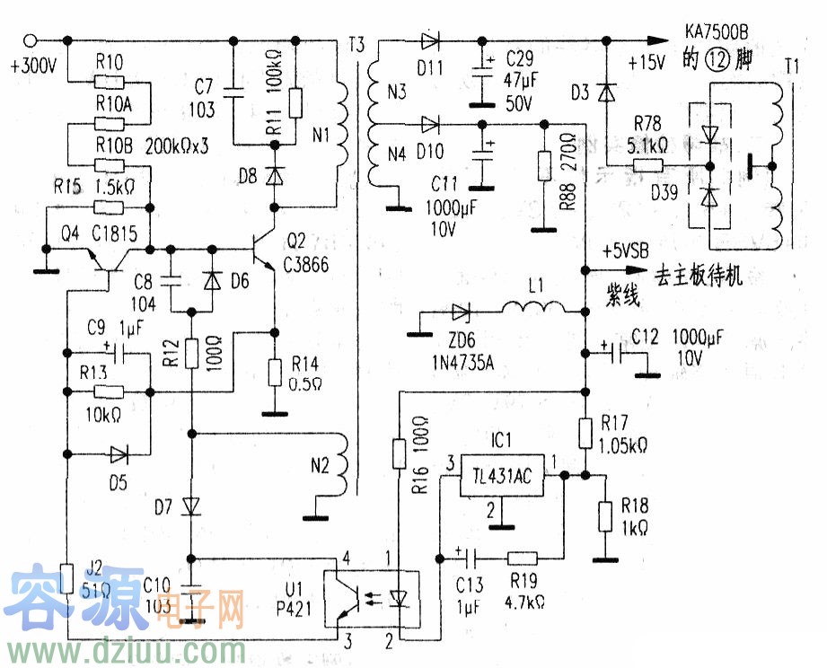 下圖所示是一款完善的開關電源電路,它的組成主要包含有開關振蕩電路【由開關管Q2(C3866)、啟動電阻R10、R10A、R10B、R15和開關變壓器T3等組成];自動穩壓控制電路[由精密穩壓器IC1(T