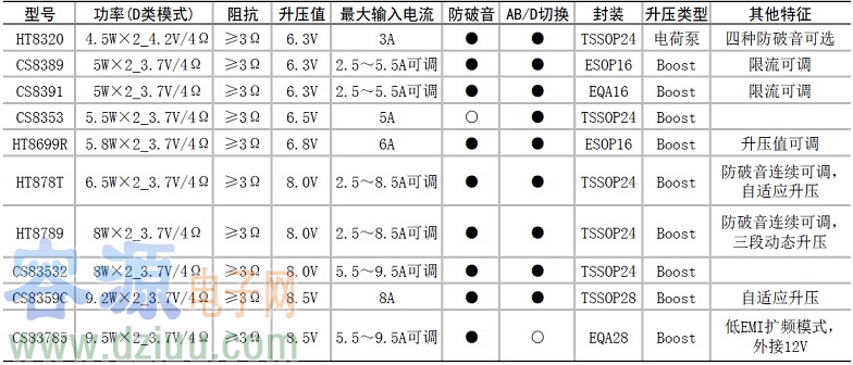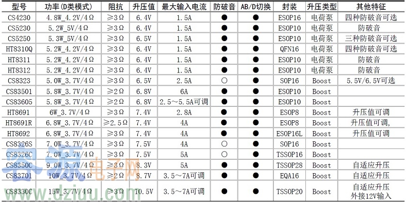 2.5V-5.5V供電內置升壓音頻功放選型表-單聲道