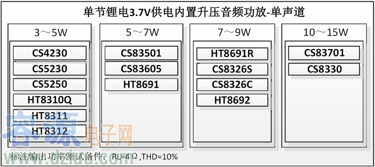 目前藍牙便攜式藍牙音箱主要以單節鋰電池的供電為主,由于電源電壓的限制,普通鋰電池直供的音頻功放輸出功率很難有實質的提升。內置升壓的音頻功放能夠突破電源的限制為音箱提供足夠的輸出功率從而帶來極致的音質體驗。深圳市永阜康科技有限公司現總結市場應用,根據功率大小的要求推出單節鋰電內置升壓音頻功放的選型推薦,詳細請閱下列圖表: