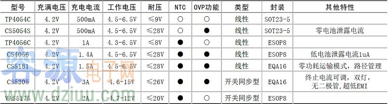 單節鋰電池充電管理選型表