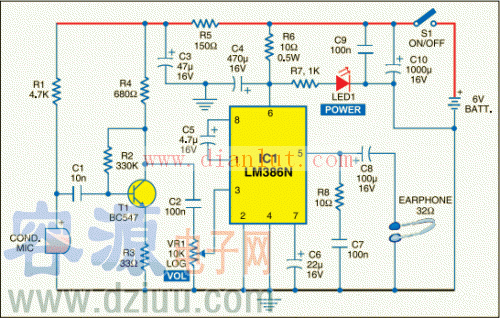 通過PC聲卡通常具有麥克風輸入,揚聲器輸出,有時線路輸入和輸出。麥克風輸入阻抗設計,只有在動態麥克風200至600歐姆范圍。拉扎爾已適應聲卡使用一個共同的駐極體傳聲器使用該電路。他提出了一個復合放大器使用