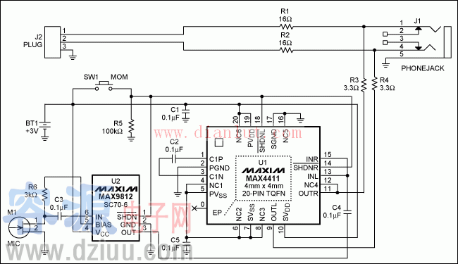 MAX4411\MAX9812耳機衰減器、放大器麥克風監測電路及