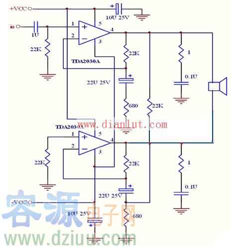 TDA2030A的BTL大功率功放電路原理圖