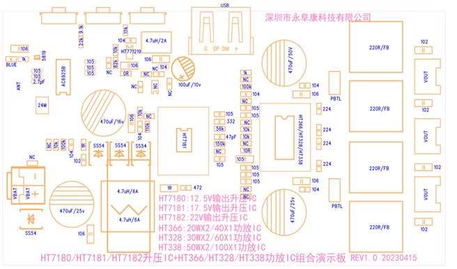 2.HT7180/HT7181/HT7182升壓IC+HT366/HT328/HT338功放IC組合演示板PCB頂層設(shè)計(jì)圖
