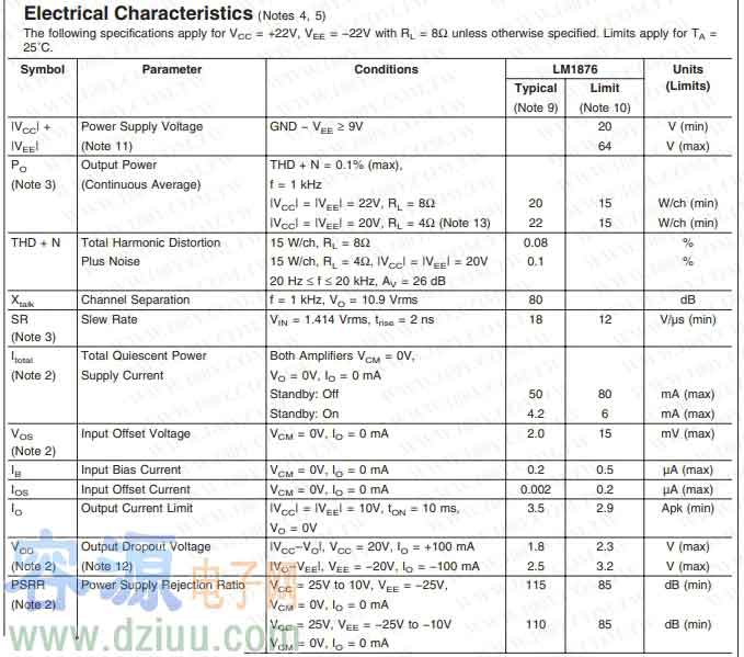 LM1876參數只收集到英文版的,沒有找到中文版。參數如下: