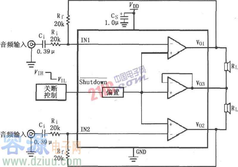 LM4916用于雙聲道放大器電路左、右聲道音頻信號分別輸入LM4916的1、5腳,經過內部放大器放大后分別由9、7腳輸出,經過耦合電容Co加到各自聲道的揚聲器上。LM4916的2腳外接關斷控制,當2腳接VDD時允許工作;接低